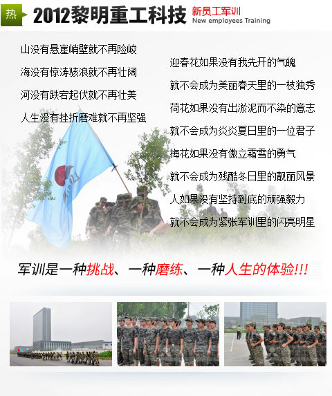 黎明重工科技自2004年啟動大學生員工計劃以來,軍訓拓訓已成為每一位新員工入職的必經之路。百余位職場新人朝夕相對,統(tǒng)一的作息時間,近似嚴苛的軍訓項目,蘊藏深意的拓訓內容。流火的七月,肆意揮灑的汗水,熱情洋溢的青春,2012屆新進職員,即將在這里開啟人生新的篇章。